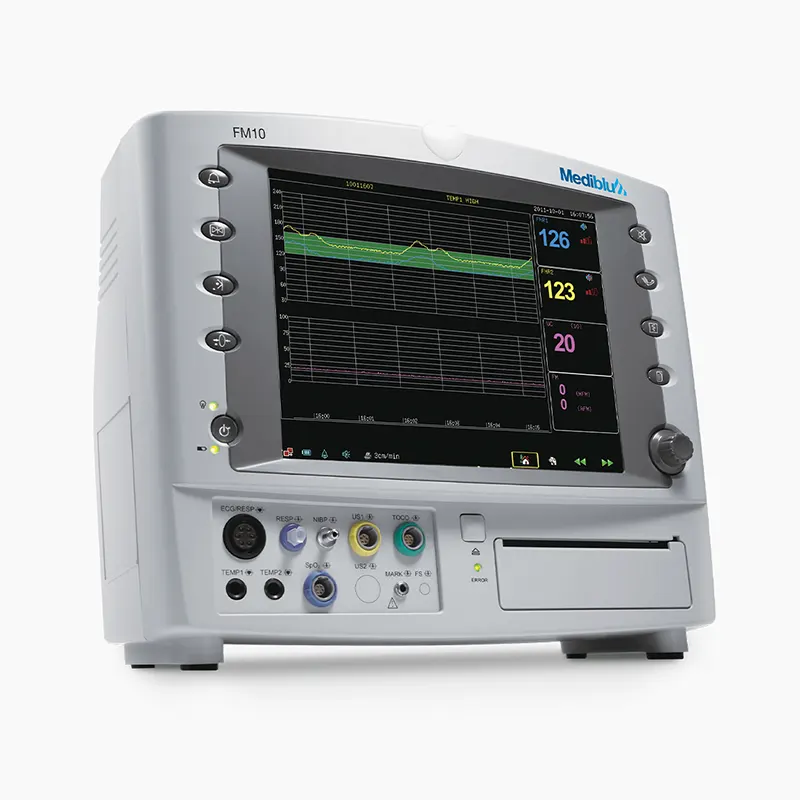 El monitor FM10 cuenta con pantalla TFT de 10.4” que muestra simultáneamente ondas y datos. Ofrece funciones completas de monitoreo fetal (FHR, TOCO, FM) y cálculo de movimiento. Incluye batería recargable y conectividad híbrida para uso flexible.